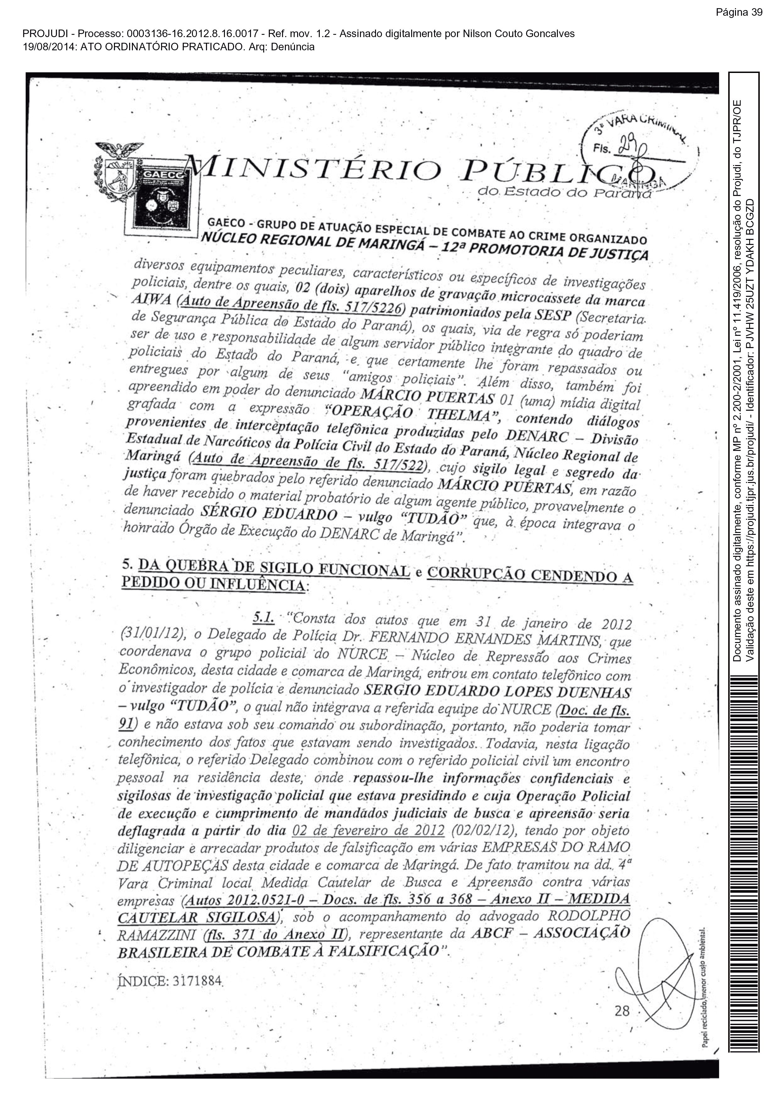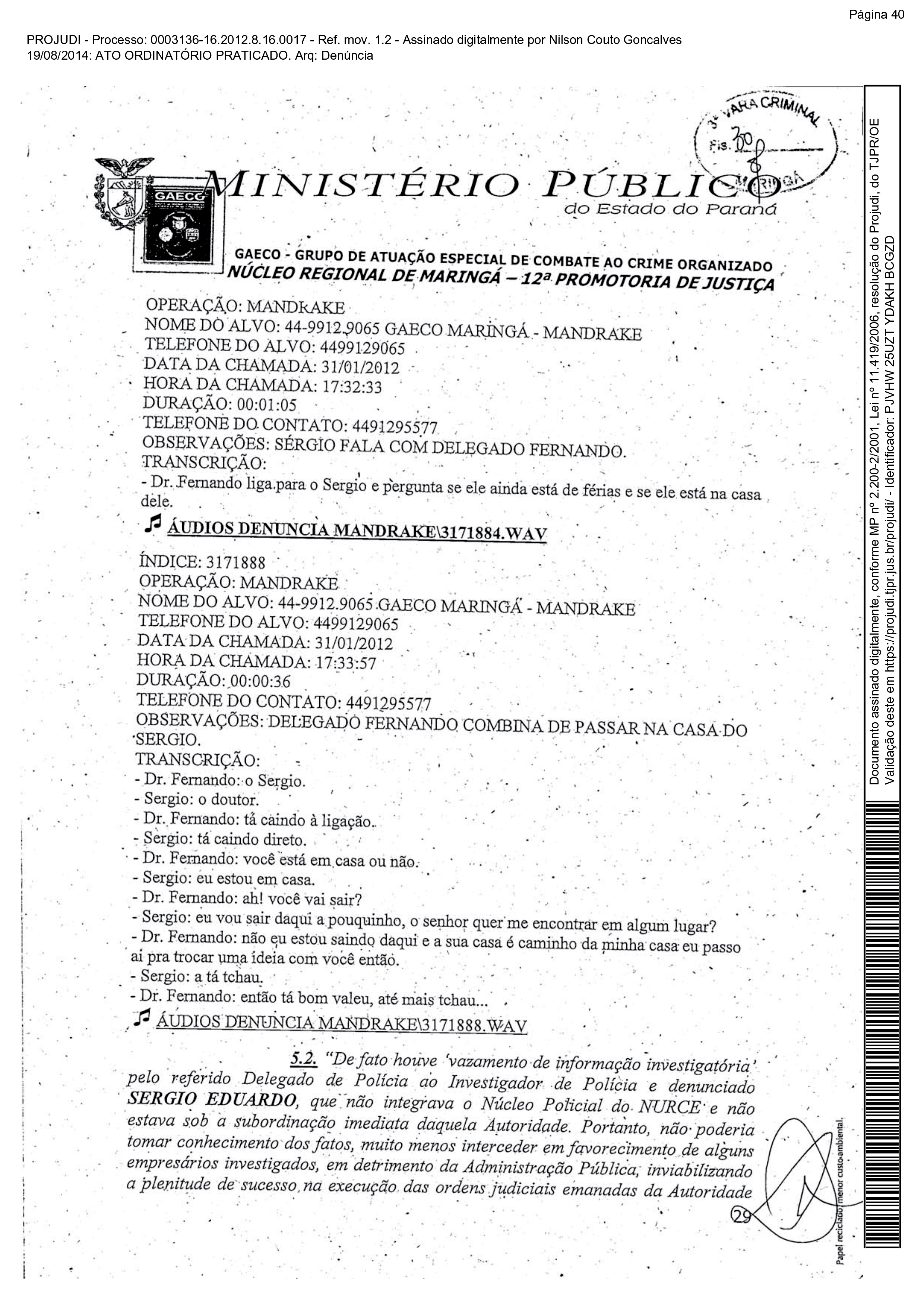 “De fato houve “vazamento de informação investigatória” pelo referido delegado de polícia ao investigador que não integrava o Nurce e não estava sob a subordinação imediata do delegado. Portanto, não poderia tomar conhecimento dos fatos, muito menos interceder em favorecimento de alguns empresários investigados, em detrimento da administração pública, inviabilizando a plenitude de sucesso na execução das ordens judiciais emanadas da autoridade judiciária competente oficialmente perante a 4ª Vara Criminal de Maringá. Por conseguinte, o doutor delegado de polícia Fernando Ernandes Martins violou sigilo funcional, revelando fato de que tinha ciência em razão do cargo e que deveria permanecer em segredo, facilitando-lhe a revelação por intermédio do referido policial”, descreve o Promotor do Gaeco Laércio Januário de Almeida.